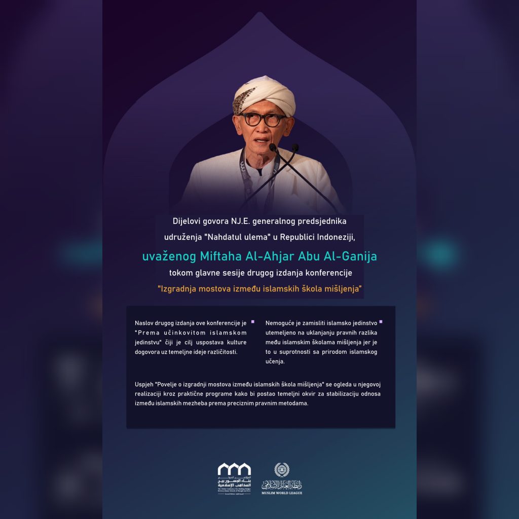 Dijelovi govora NJ.E. generalnog predsjednika udruženja “Nahdatul #ulema” u Republici Indoneziji, uvaženog Miftaha Al-Ahjar Abu Al-Ganija, tokom glavne sesije drugog izdanja konferencije “Izgradnja mostova između islamskih škola mišljenja”
